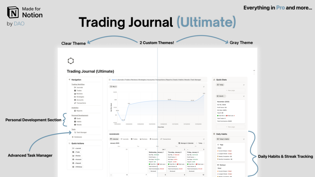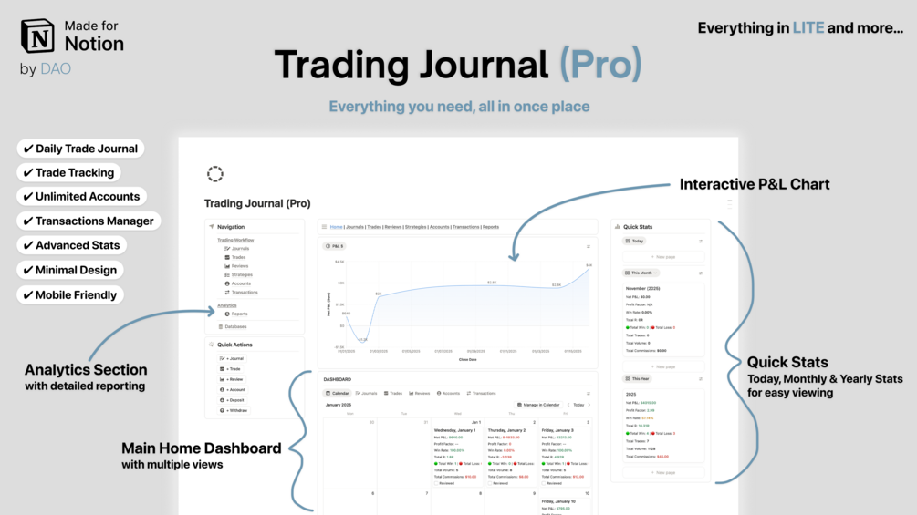 This Notion Trading Journal is your all-in-one solution that gives you everything you need to grow as a trader. From simple trade logging to advanced performance metrics, this system adapts to your trading style.